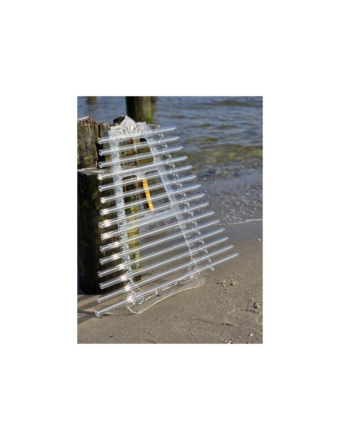 Este instrumento es completamente transparente. El cuerpo está hecho de acrílico y todos los elementos adicionales permiten el paso de la luz, lo que lo hace más etéreo. Los 15 tubos melódicos están hechos de cristal de cuarzo puro.