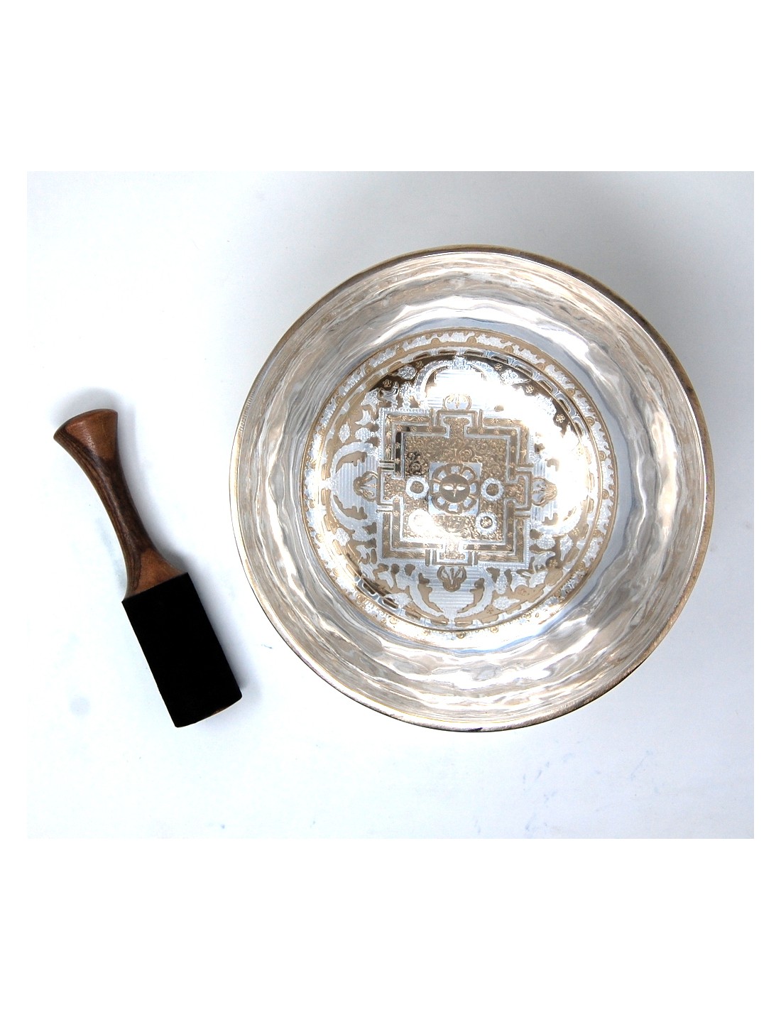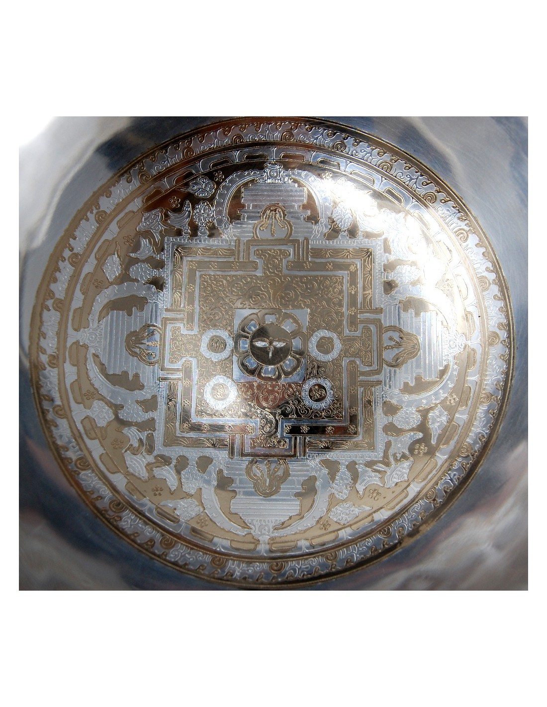 Cuenco de 7 metales tipo jambati de gran calidad. Bañado en plata y con un mandala budista grabado a martillo y cincel en su interior.