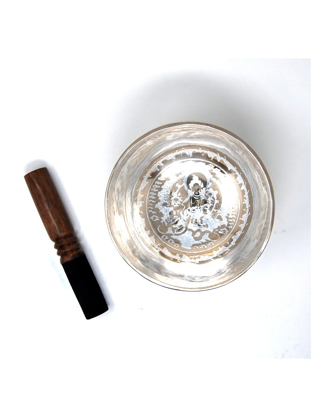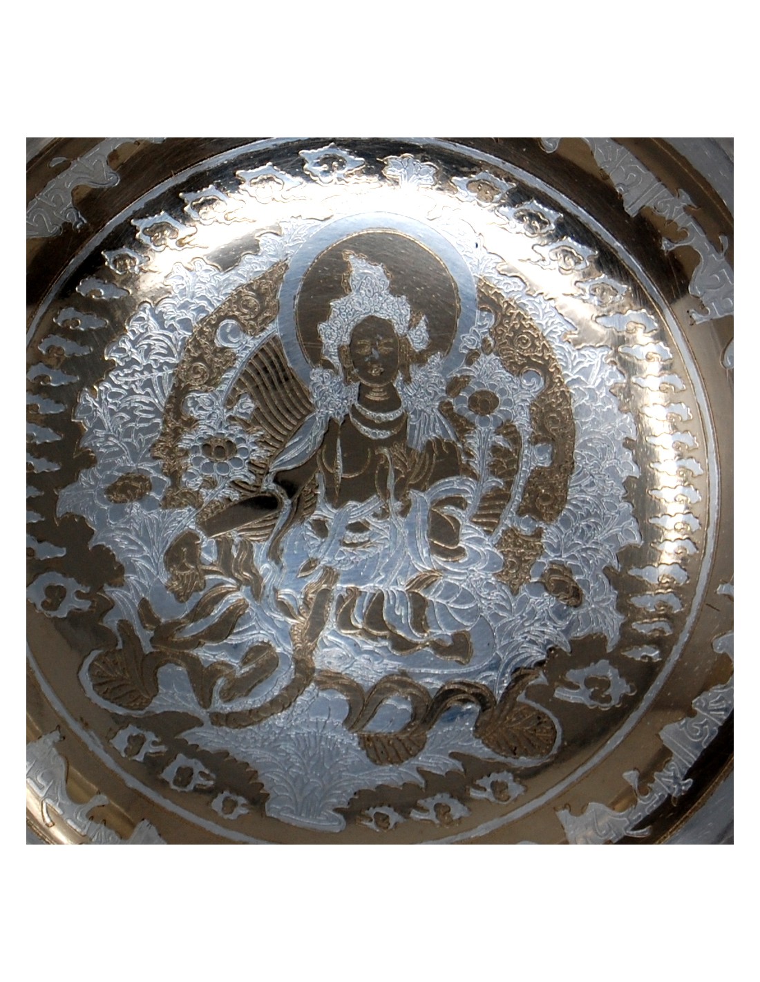 Cuenco de 7 metales tipo jambati de gran calidad. Bañado en plata y con la imagen de "Tara Verde" grabado a martillo y cincel en su interior.