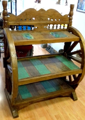 Precioso expositor de 3 baldas realizado en madera de Teka con pintura decapada.
