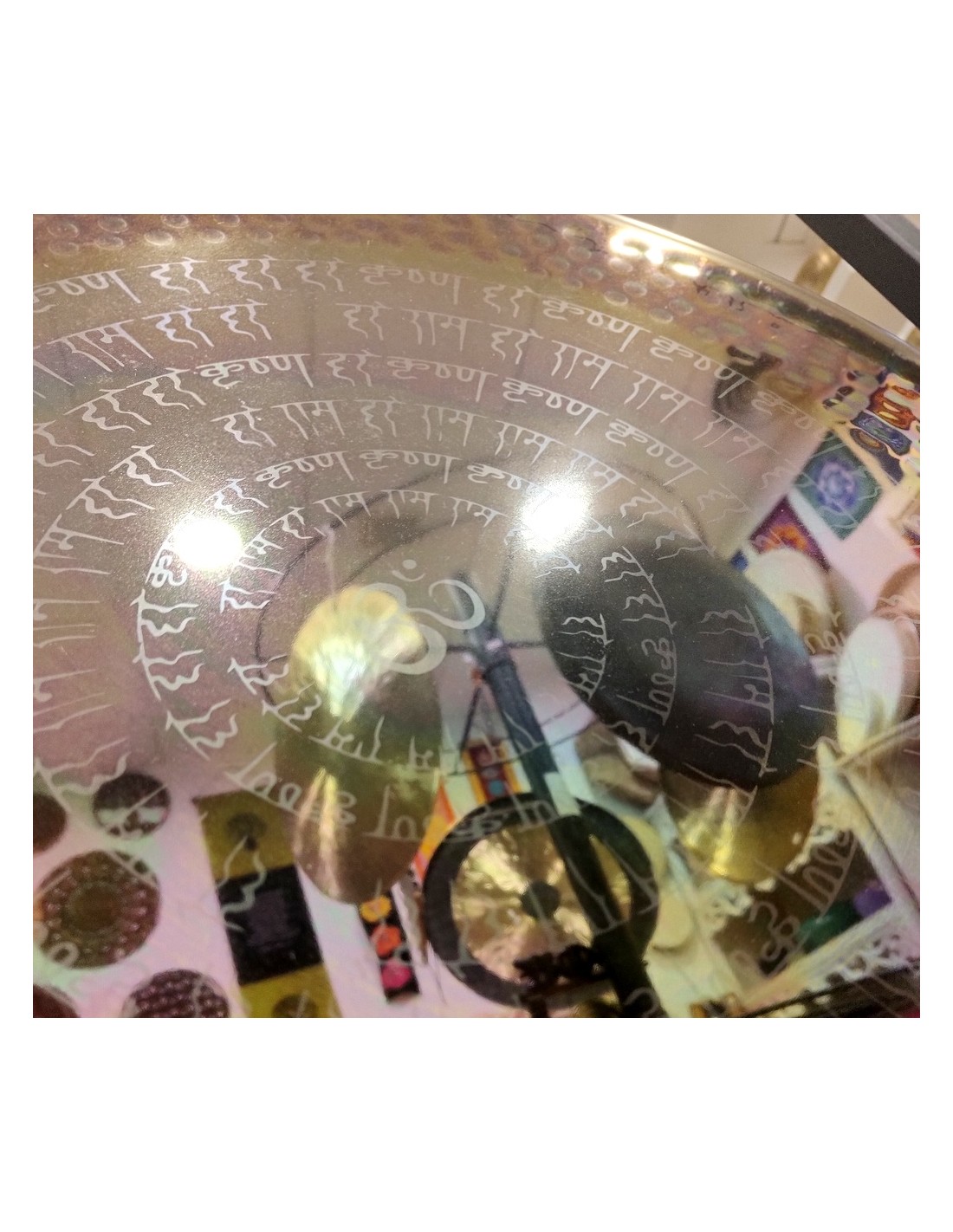 Gong de 60 cms. de sonido profundo y expansivo grabado con la imagen del Om en el centro y un mantra grabado alrededor.