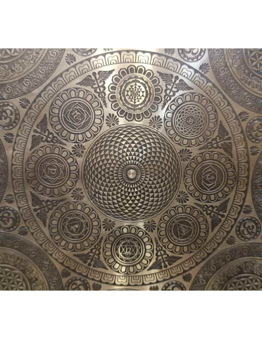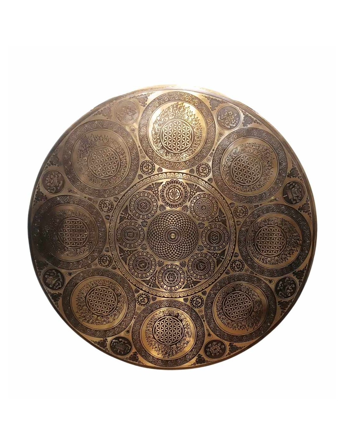 Gong Tam tam con sonido profundo y repleto de armónicos. Grabado artesanalmente en el centro un "Mandala" y alrededor el mantra "lOm mane padme hum". En el círculo exterior representaciones de "La flor de la vida"