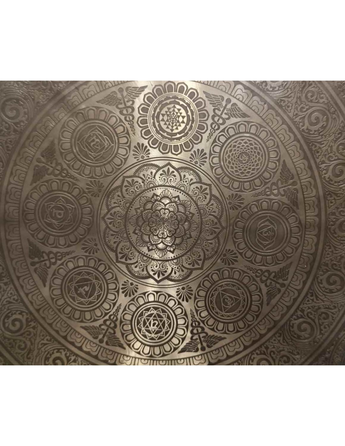 Gong Tam tam con sonido profundo y repleto de armónicos. Grabado artesanalmente en el centro una flor en forma de Mandala, en el siguiente círculo el mantra "om mane..." y el "Shree yantra" y en el círculo exterior "la flor de la vida.