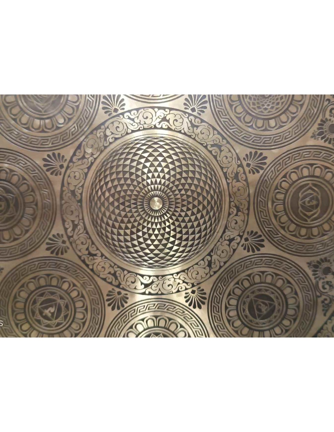 Gong Tam tam con sonido profundo y repleto de armónicos. Grabado artesanalmente en el centro un "Mandala" y alrededor el mantra "Om mane padme hum". En el círculo exterior diversas representaciones de "La flor de la vida"