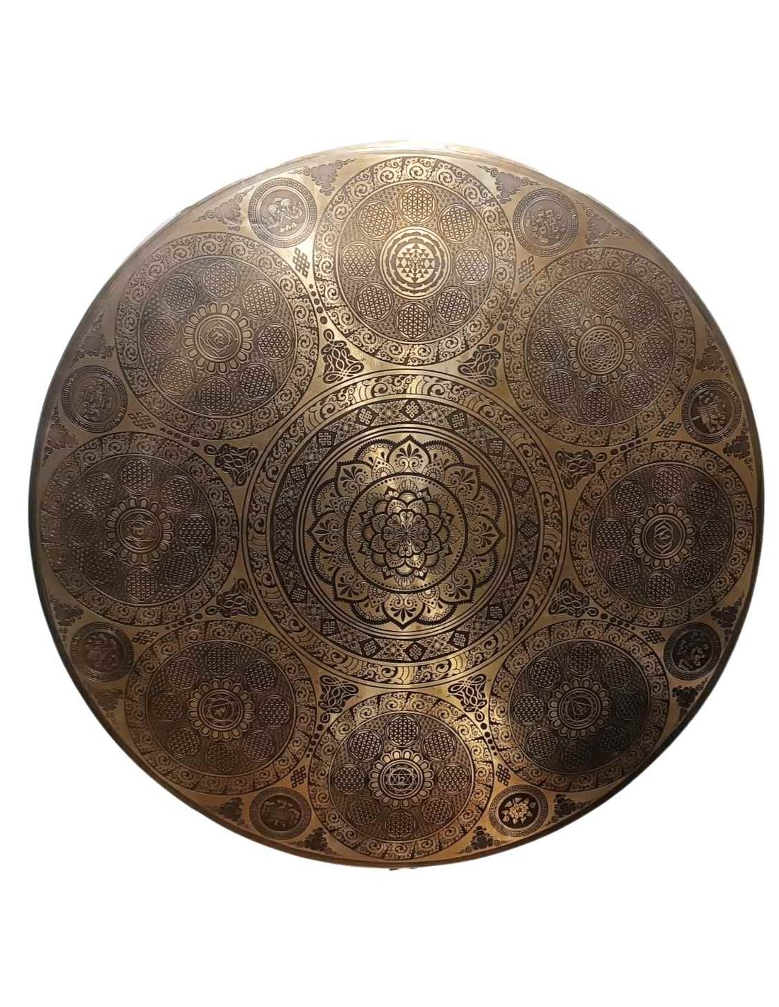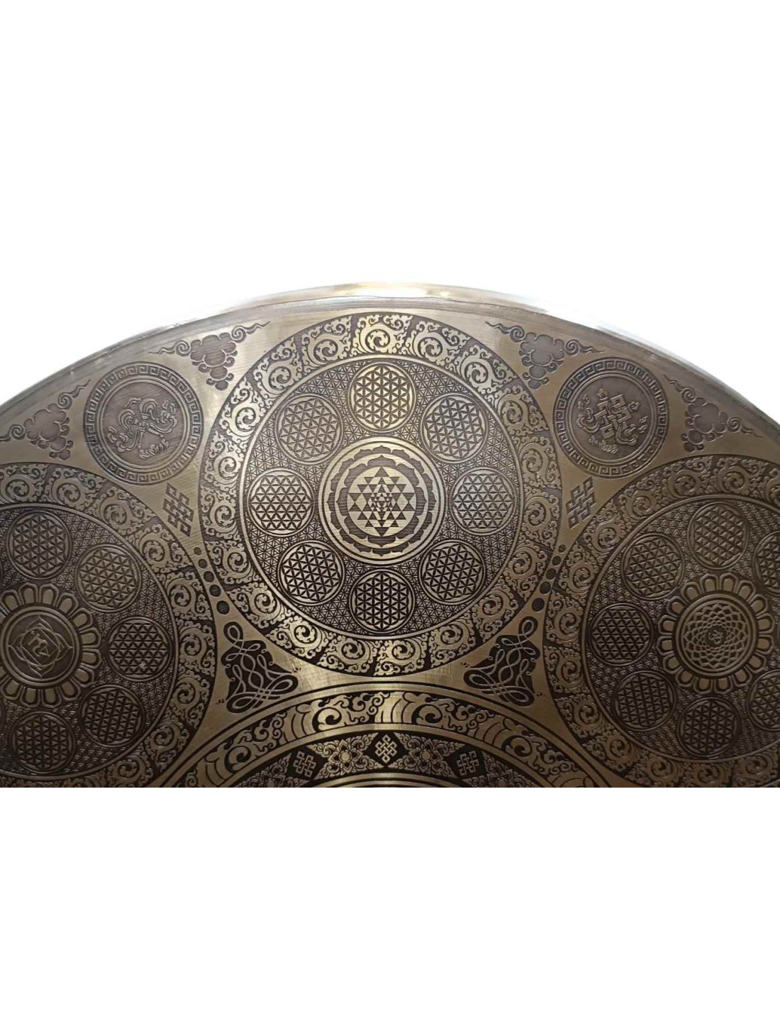 Gong Tam tam con sonido profundo y repleto de armónicos. Grabado artesanalmente en el centro un Mandala en forma de flor y alrededor diversos diseños con "la flor de la vida"