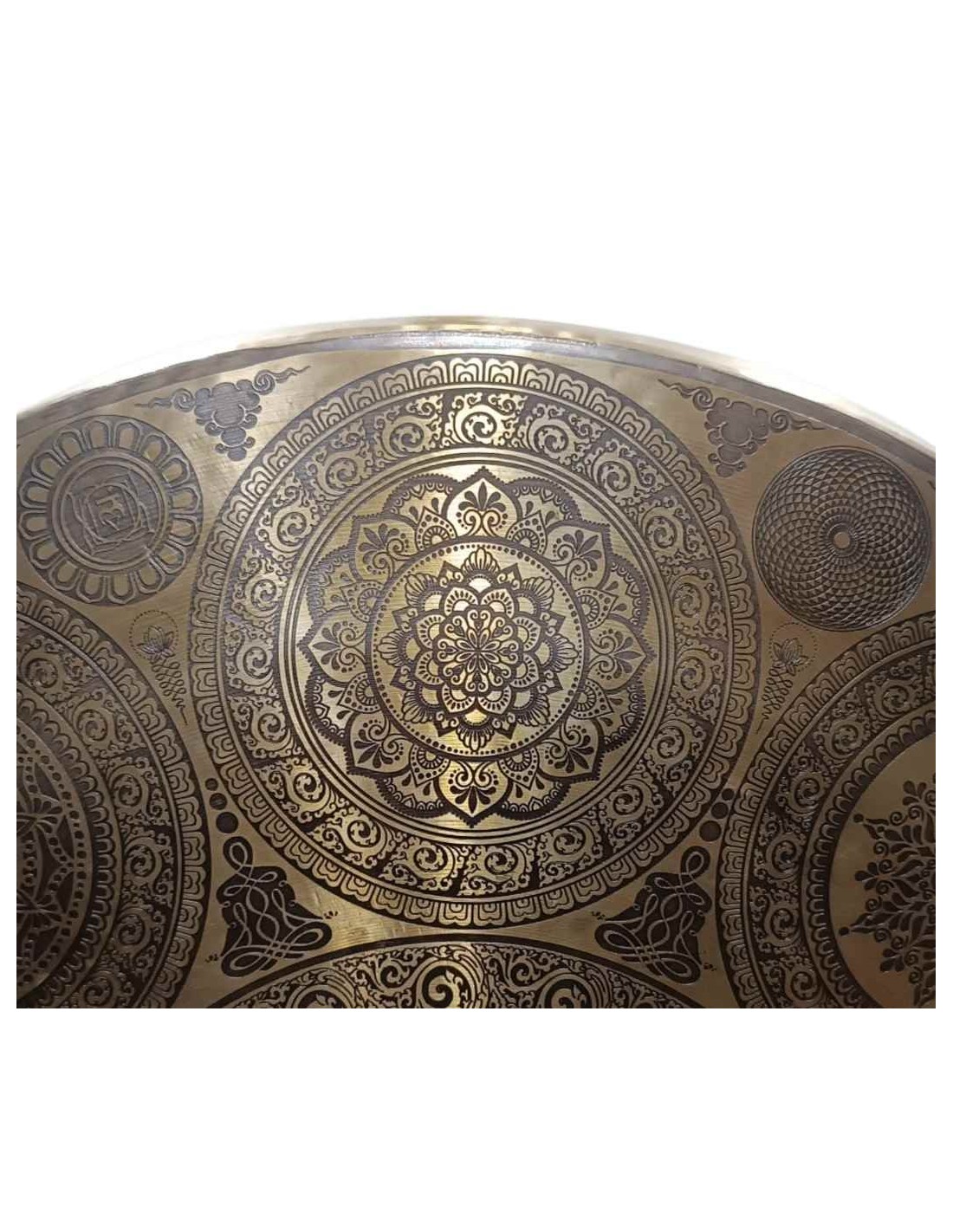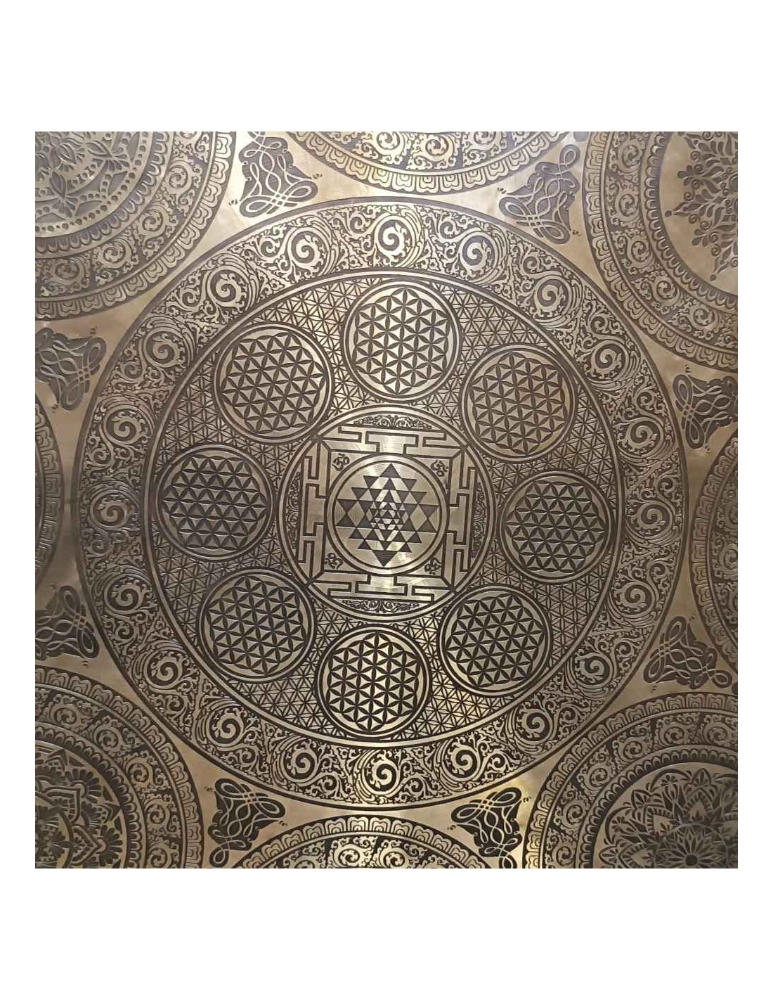 Gong Tam tam con sonido profundo y repleto de armónicos. Grabado artesanalmente en el centro el "Shree yantra" y alrededor "la flor de la vida". En el círculo exterior hay diversos modelos de Mandala en flor.