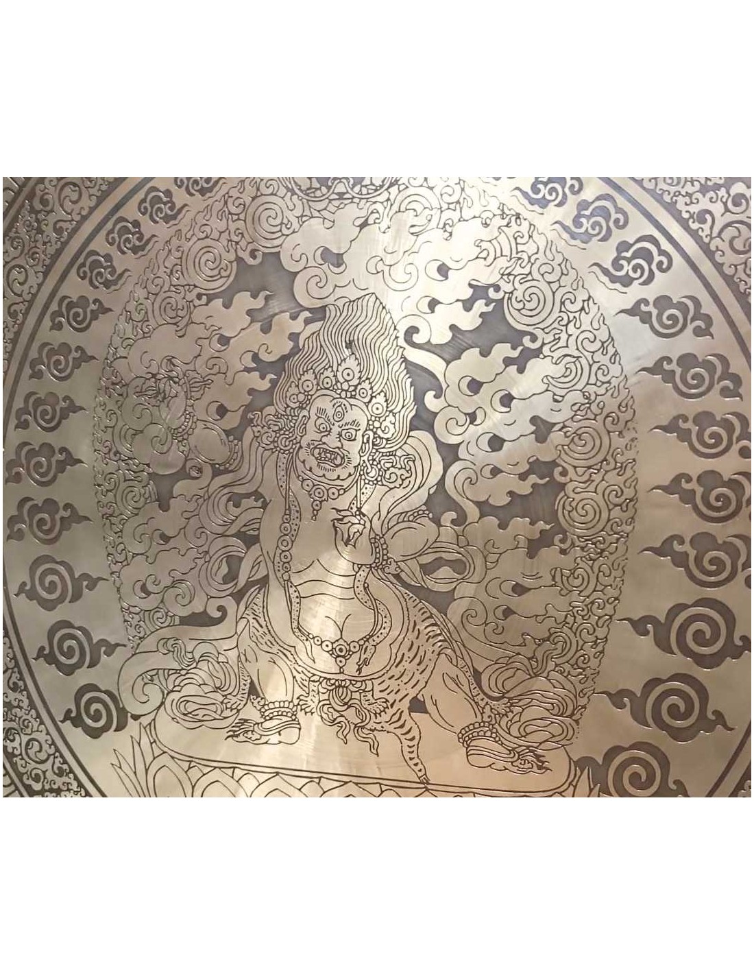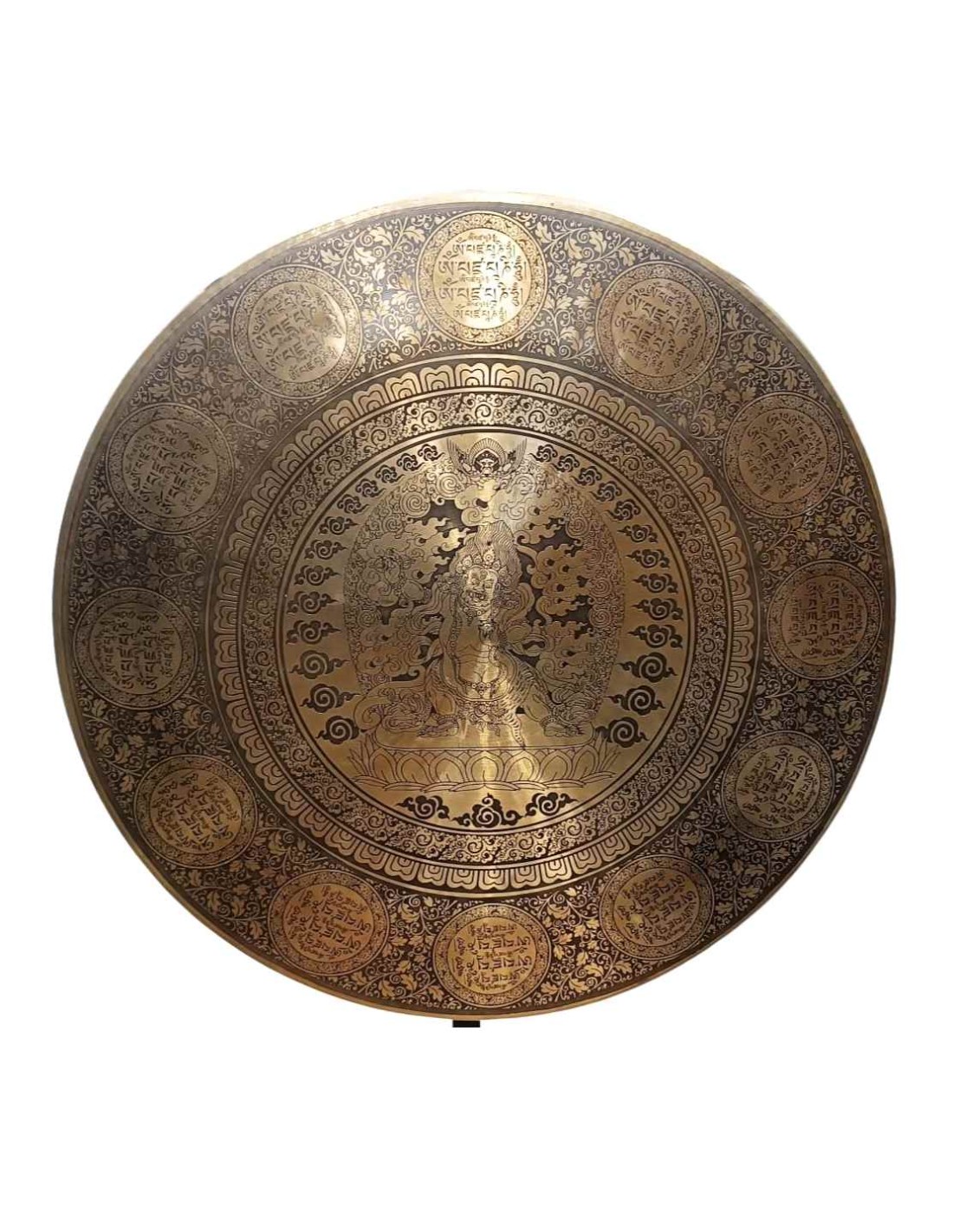 Gong Tam tam con sonido profundo y repleto de armónicos. Grabado artesanalmente en el centro la imagen de Zambala (prosperidad) y alrededor su mantra.