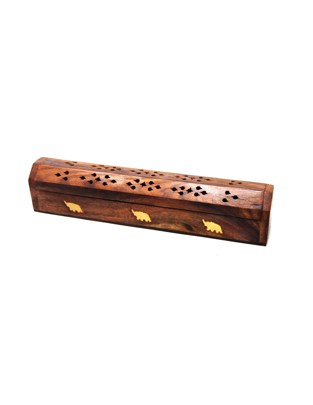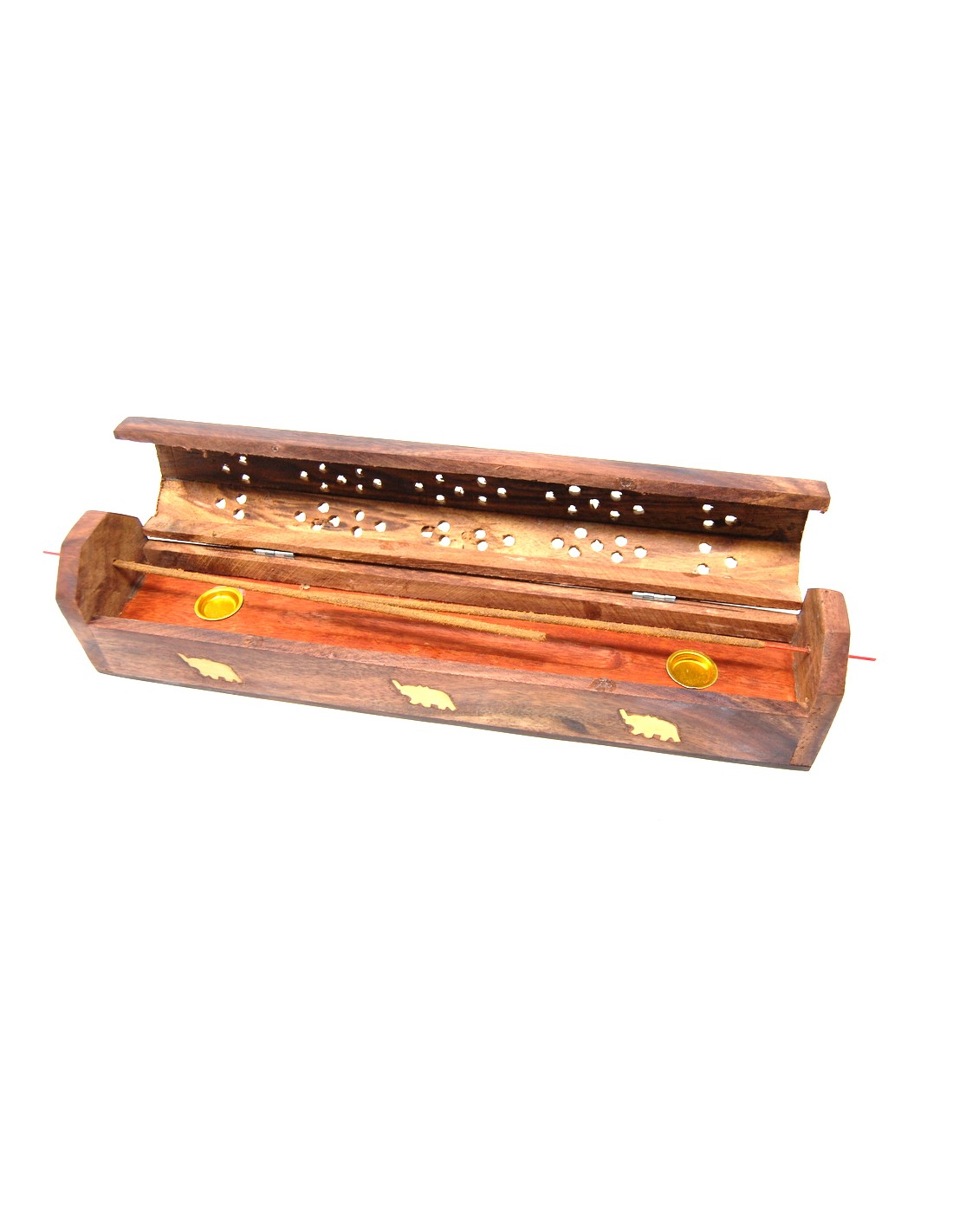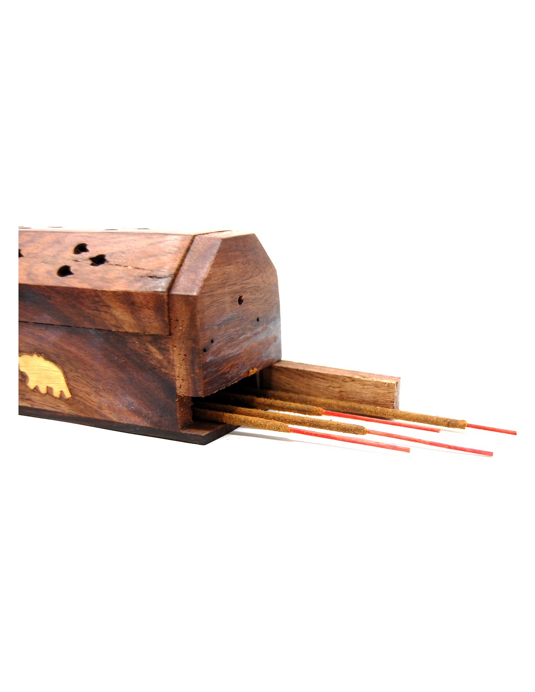 Incensario de madera alargado. Apto para incienso con caña e incienso de cono. Cuenta con un compartimento diseñado para guardar incienso de caña.