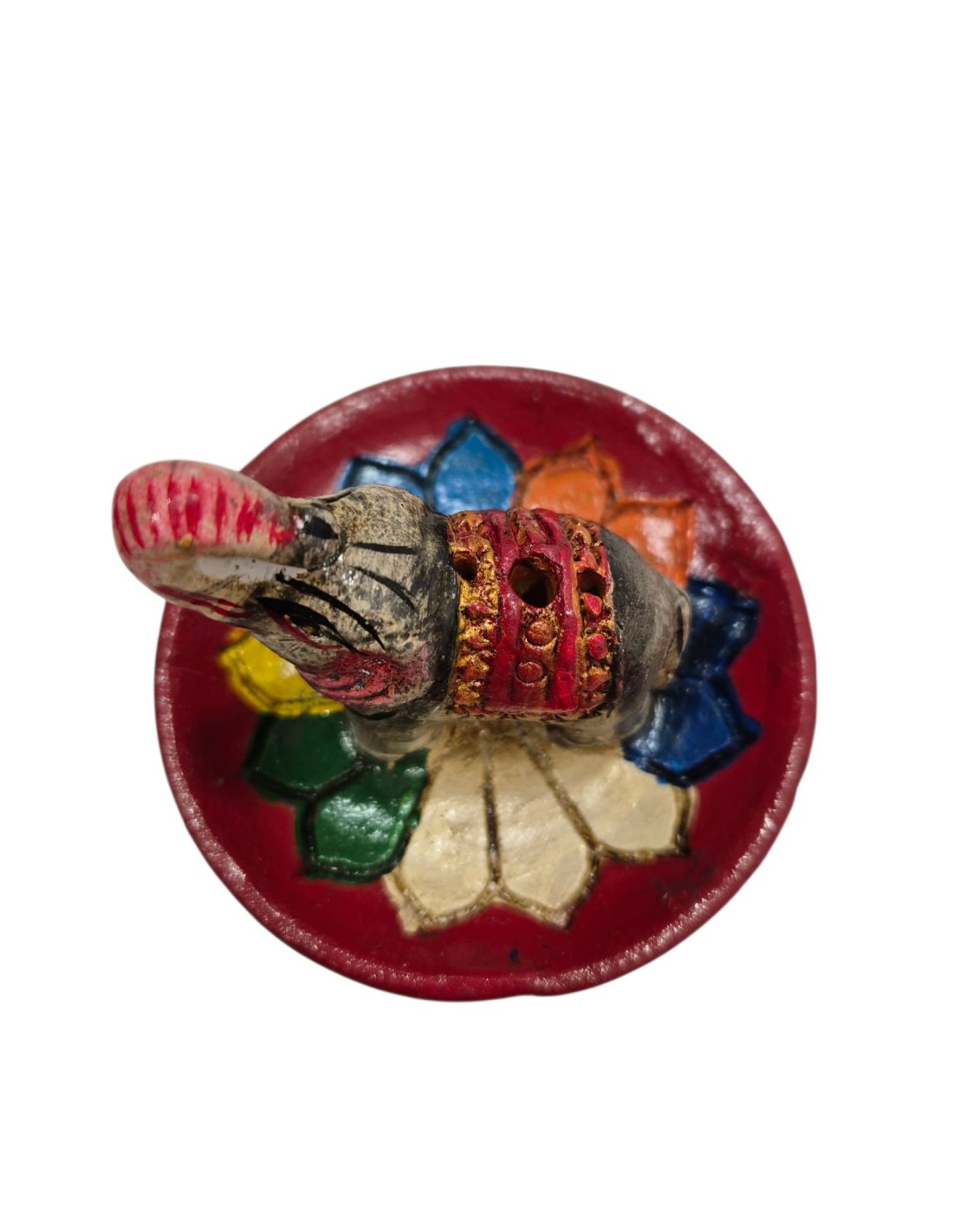 Incensario de terracota para barra fina y gruesa que representa un elefante sobre una flor de loto. Pintado a mano.
