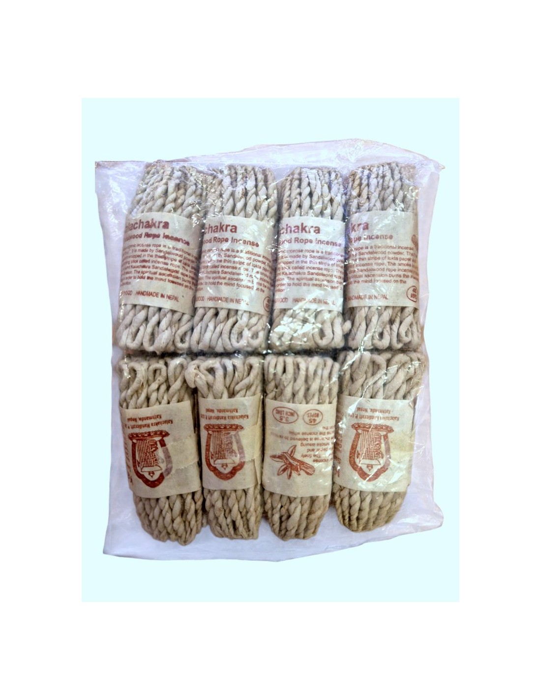 "Sandalwood" es un incienso ecológico en polvo envuelto y trenzado en un papel fino, por lo que se puede quemar en cualquier superficie (Como consejo, es mejor ponerlo sobre una cama de arroz o tierra). Dura unos 15 minutos y se pasa por la estancia antes de depositarlo en el suelo. Está realizado a partir de madera de Sandalo.