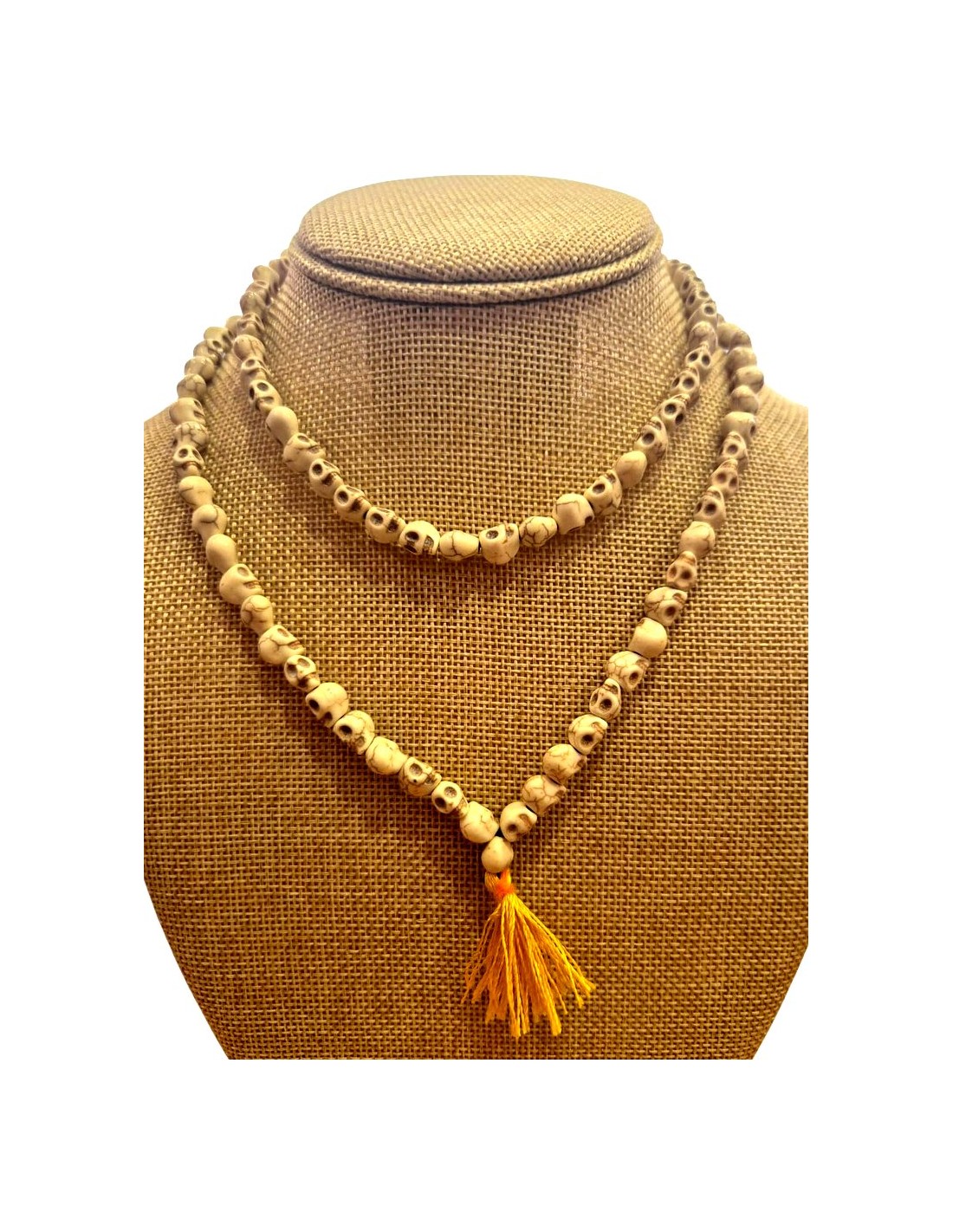 Mala realizada en hueso con la forma de una calavera trabajada a mano en cada una de las 108 cuentas.