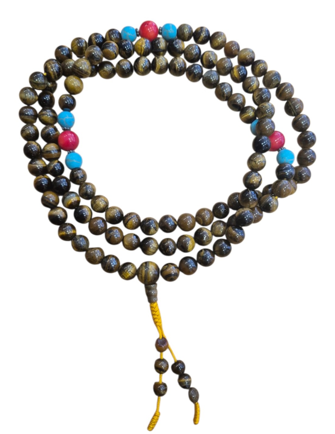 Japamala de Ojo de Tigre con tres divisiones "decorativas" de howlita azul y coral en medio.