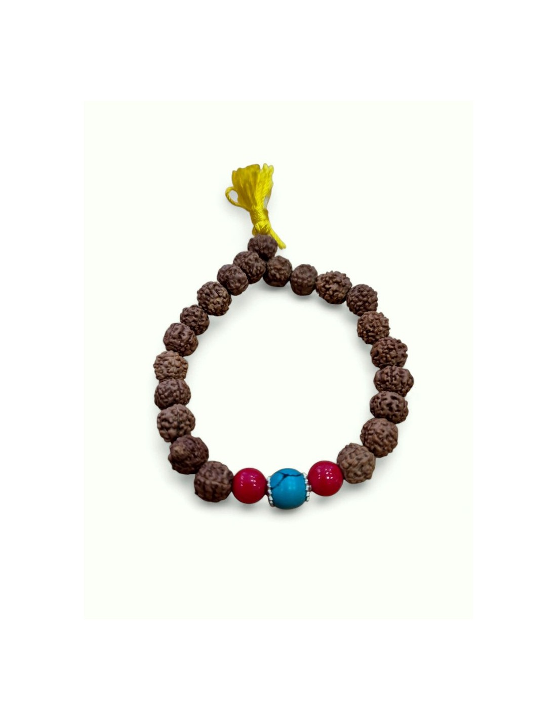 Japa de pulsera de semilla de rudraksa con turquesita. Elastica.