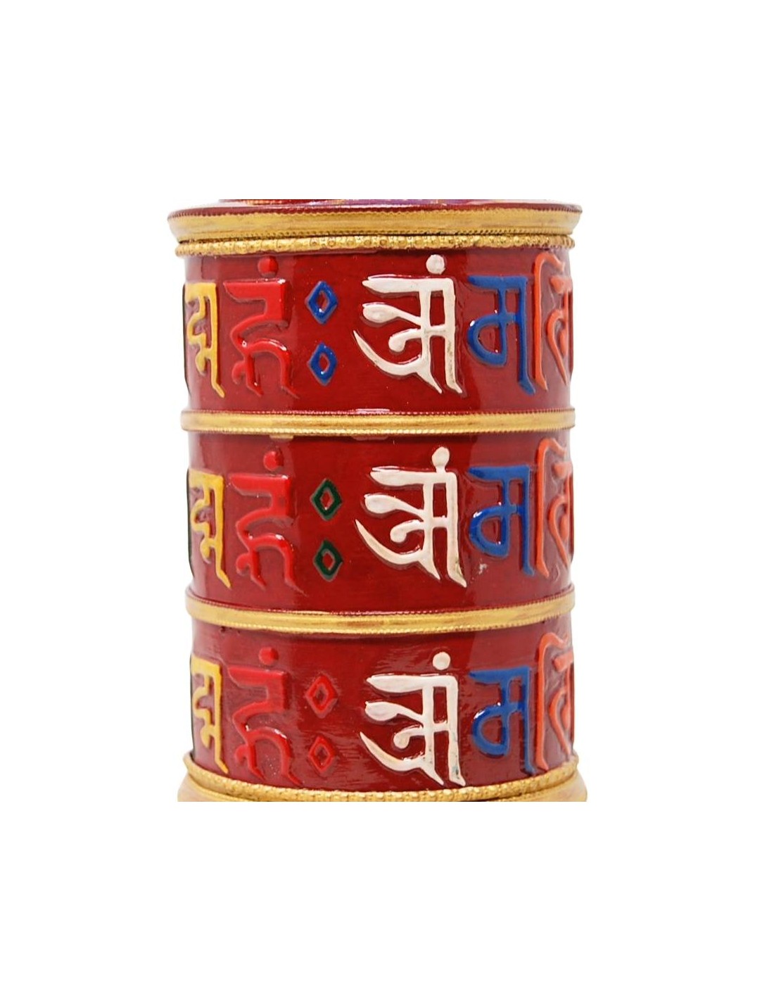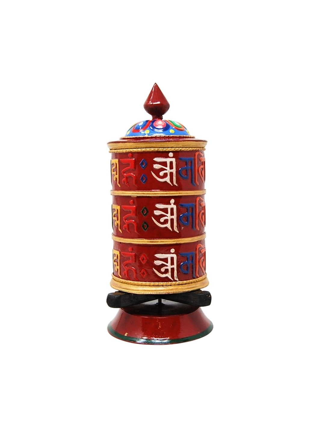 Rueda de oración realizada a mano en metal con el mantra "Om mane padme hum " grabado en su exterior, pintada a mano y rellena con el mismo mantra.