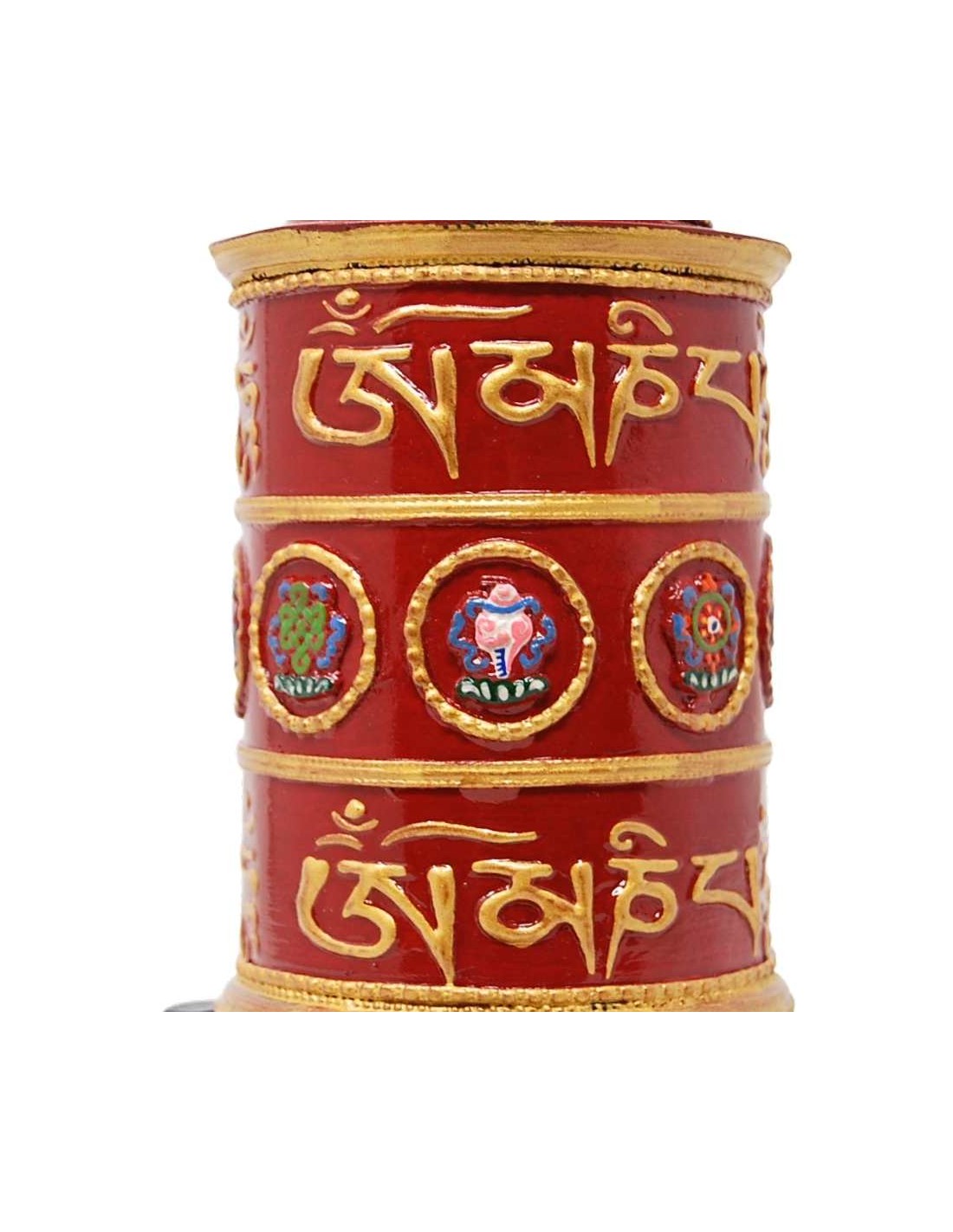 Rueda de oración realizada a mano en metal con el mantra "Om mane padme hum " grabado en su exterior y los "8 signos auspiciosos" en el centro. Relleno con el mismo mantra.