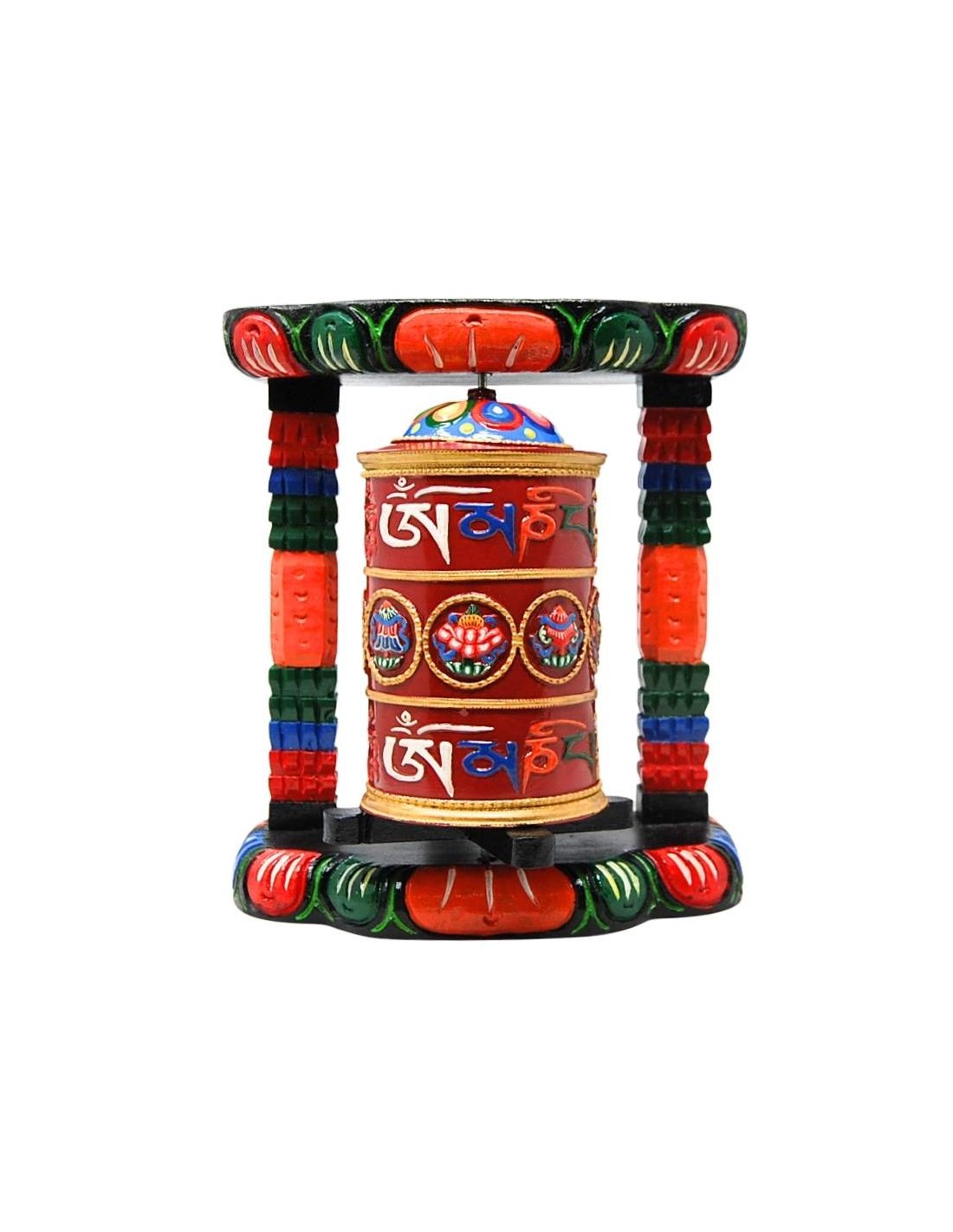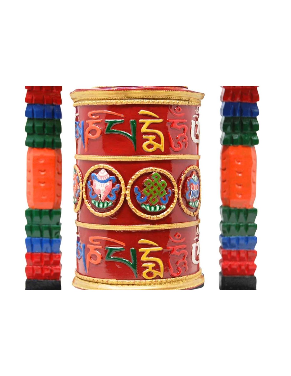 Rueda de oración realizada a mano en metal con el mantra "Om mane padme hum " grabado en su exterior y los "8 signos auspiciosos" en el centro. Rellena con el mantra "om mane..." Se presenta dentro de un soporte de madera también tallado y pintado a mano