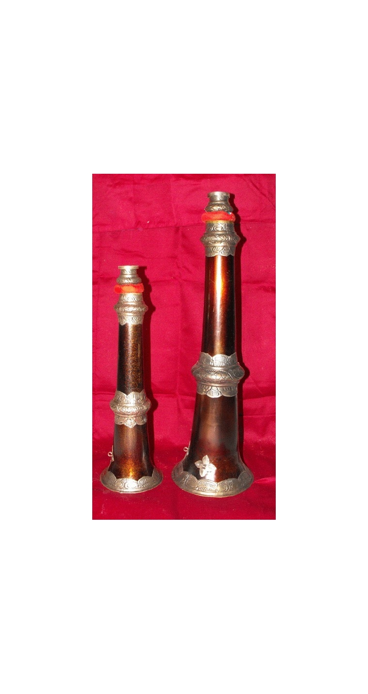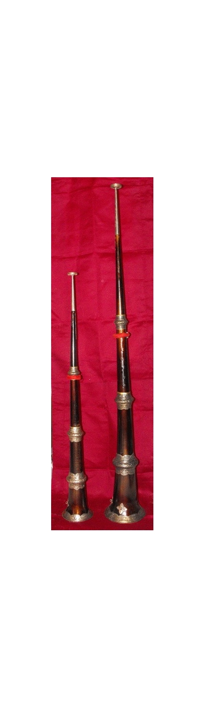 Trompa tibetana. Compuesta de tres partes extensibles, alcanza 120 mts. totalmente desplegada como se puede ver en la foto para hacerla sonar.