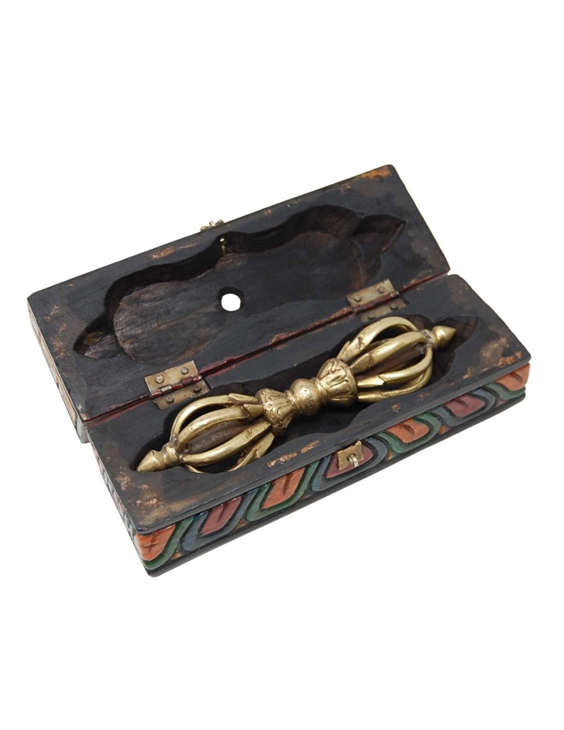 Caja de madera tibetana con el mantra "Om ah hum" y que sirve de funda a un dorje de metal