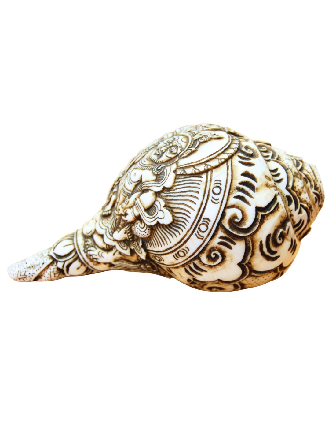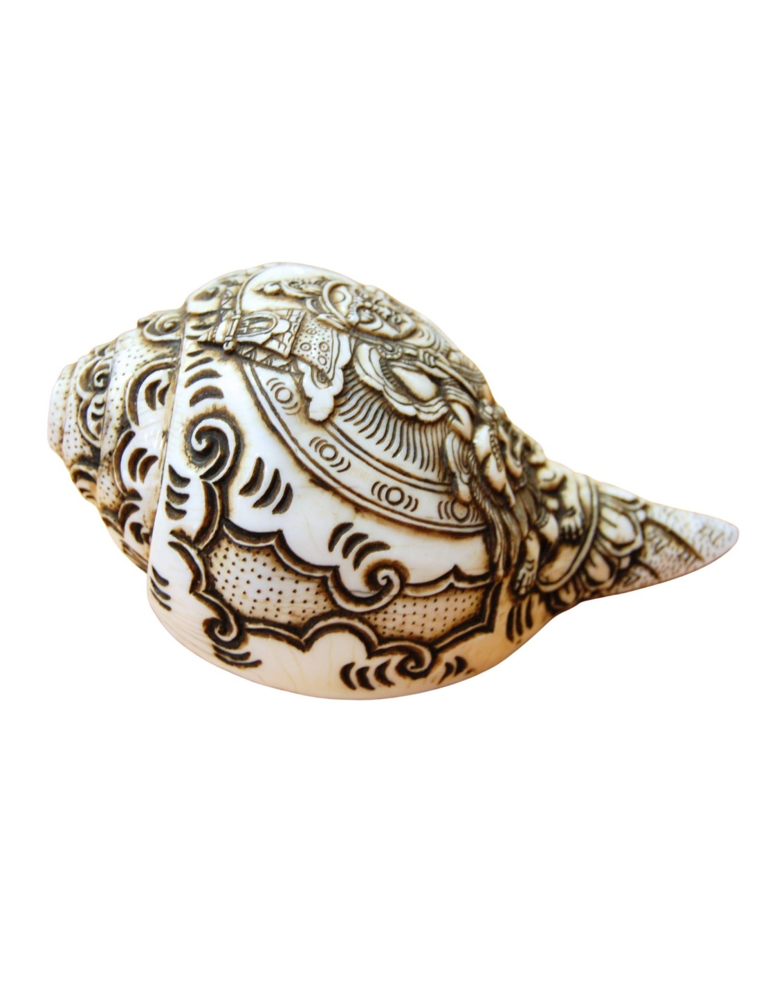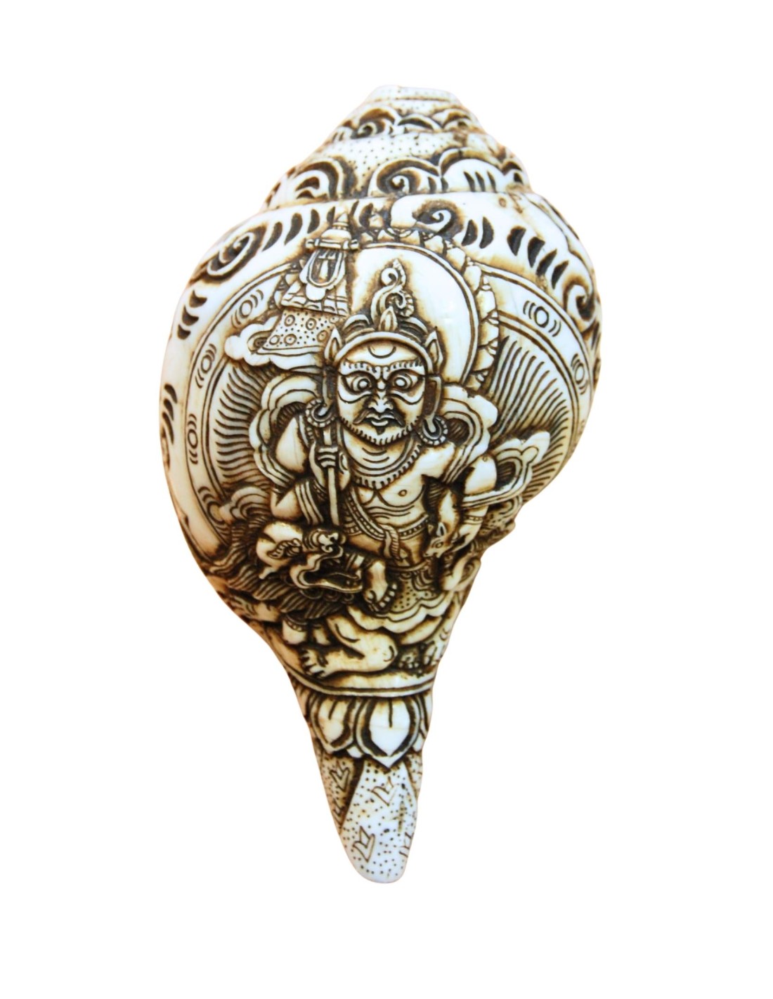 Pieza única de Caracola natural preciosamente tallada a mano en Nepal. Representa la imagen de "Vaiśravaṇa". Asociada con la riqueza, la prosperidad y la protección de los practicantes del Dharma.