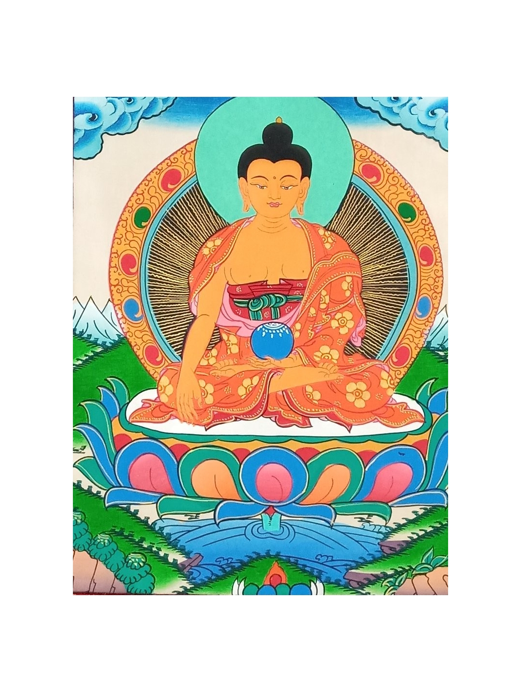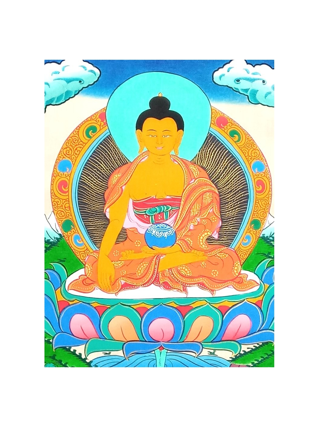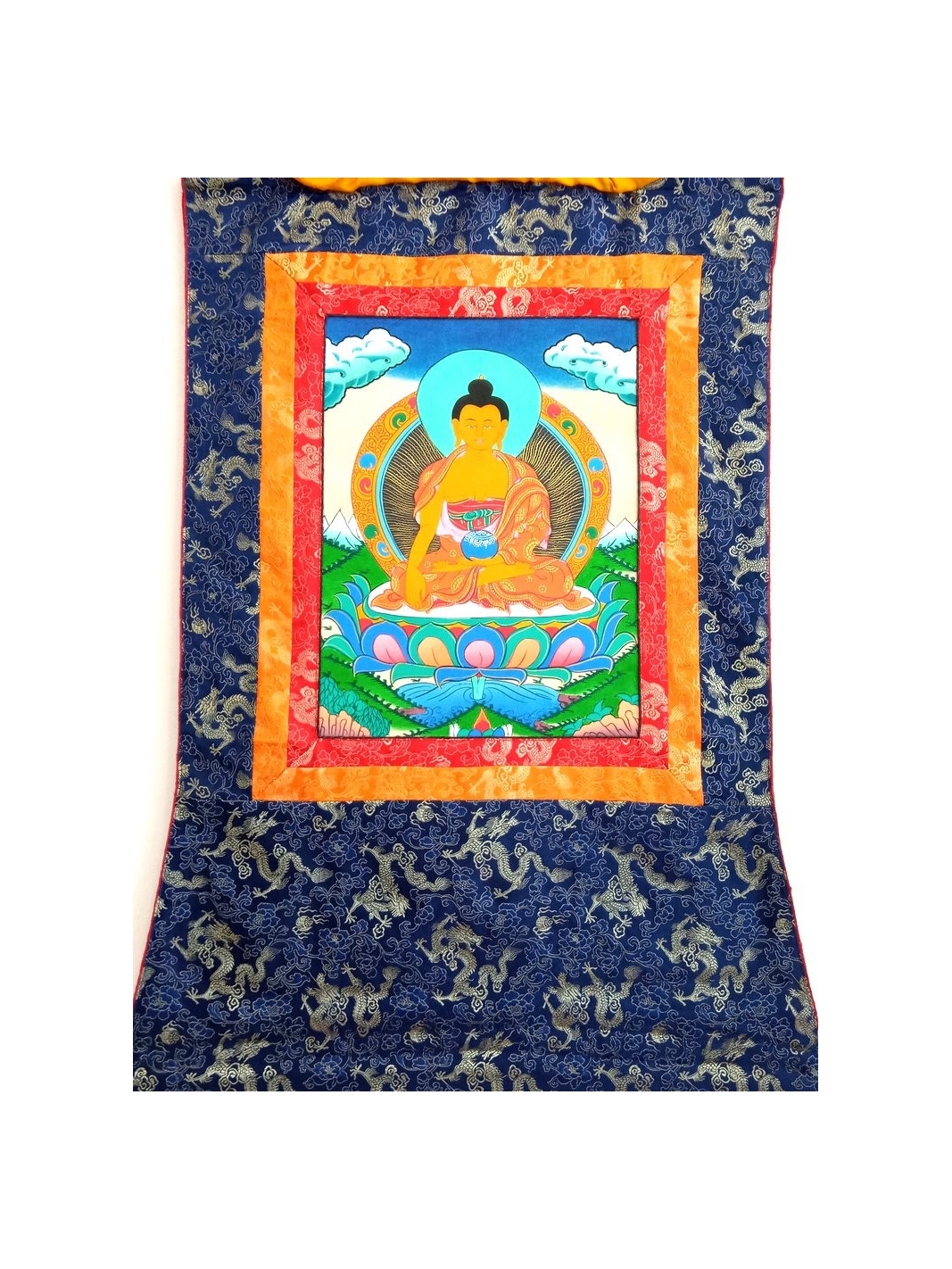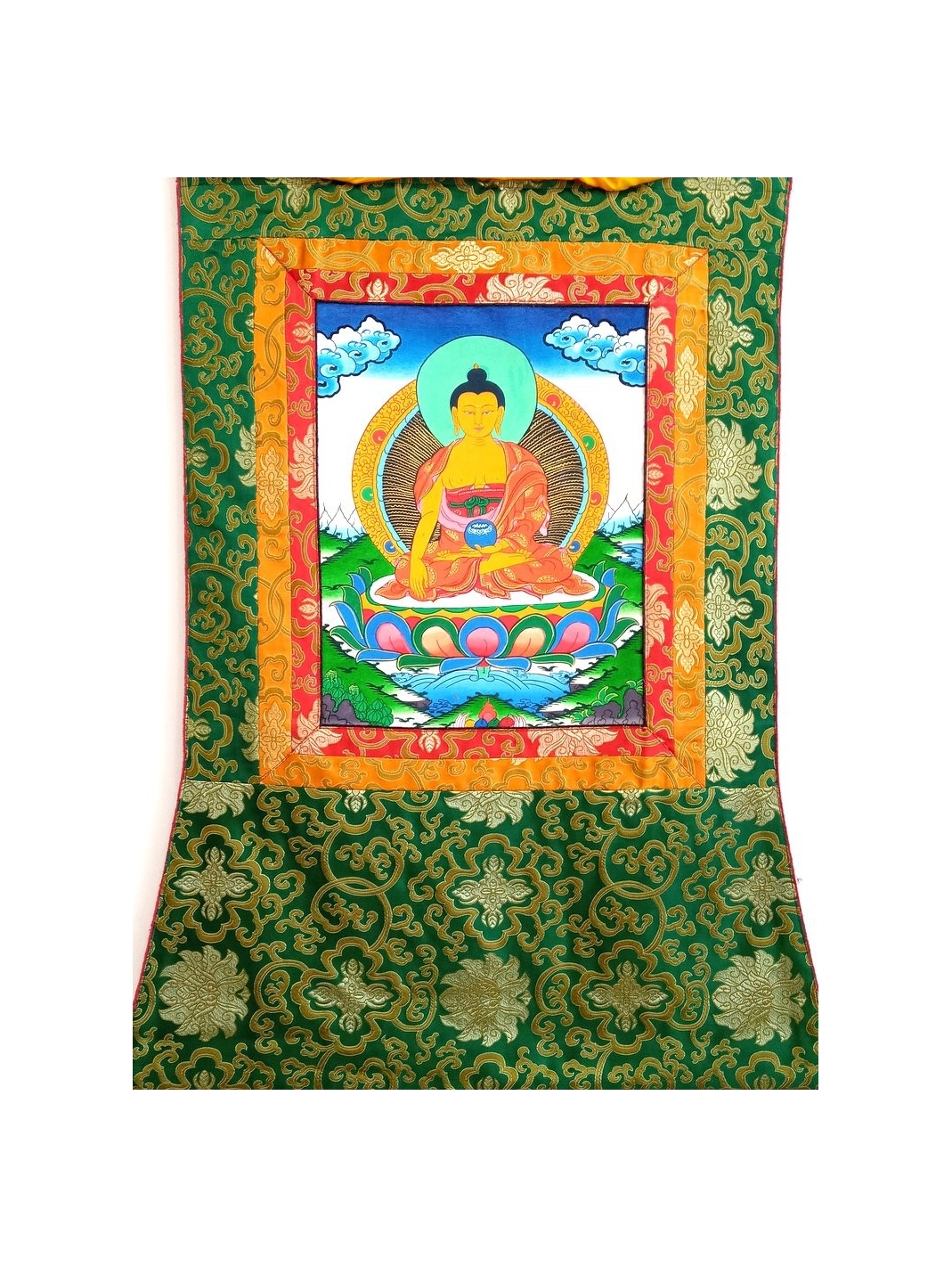 Thangka pintado a mano en lienzo de algodón y cosido a un brocado de seda. Respresenta a Buda Sakiamuni, el Buda maestro.